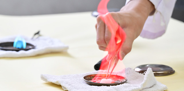 化学研究会による、炎色反応の演示。長く観察できるように、水溶液を浸したメラミンスポンジを燃やすという工夫がされていました