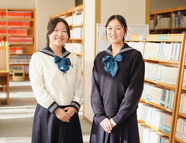 アメリカで1年派遣留学を経験した国際学級のS.U.さん(左)と一般学級のS.I.さん(右)。「留学を通して、どんなことにも自信を持って行動できるようになりました」と口をそろえます
